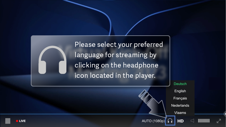 When you join the livestream, you are able to select your preferred language for streaming by clicking on the headphone icon located in the player.